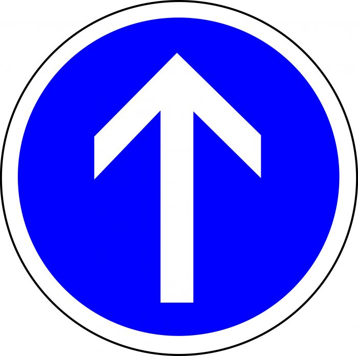 - Le panneau sens unique, qui est de forme carrée et de couleur bleue. En son centre, apparaît une épaisse flèche blanche.