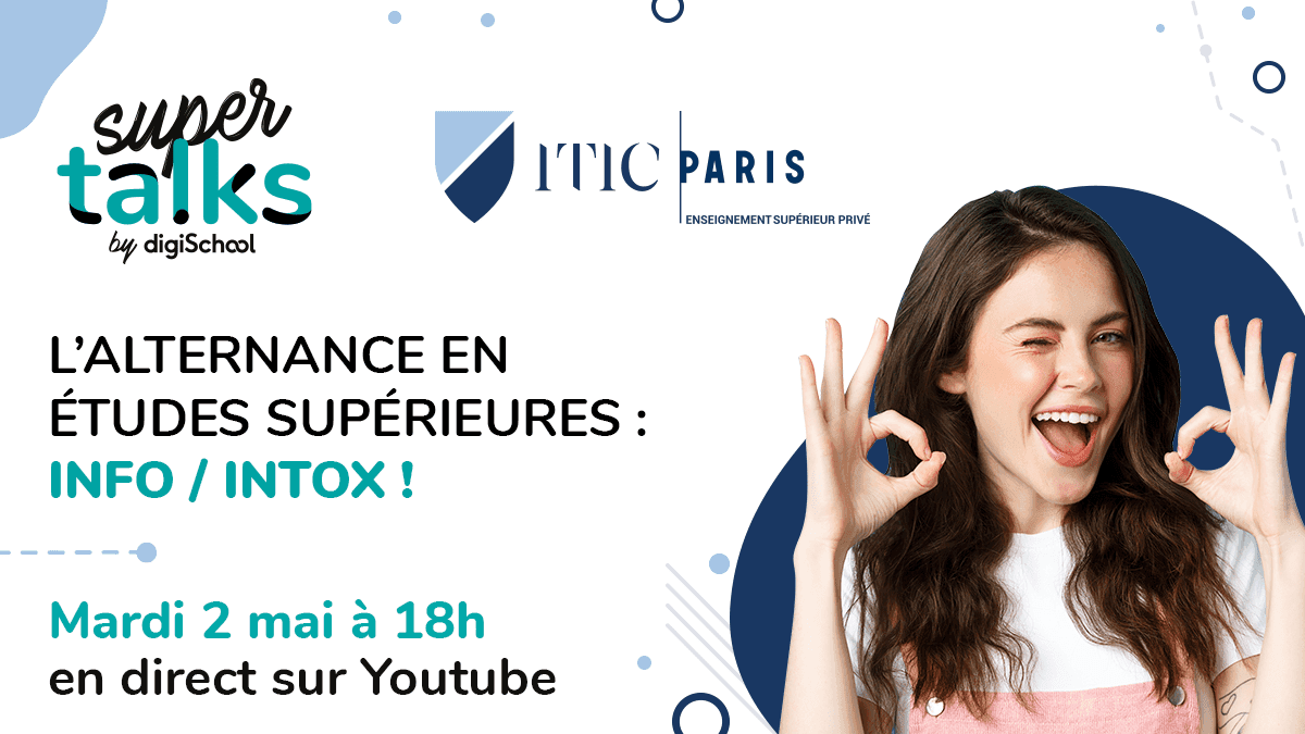 Pour en savoir d’avantage, retrouve-nous, mardi 2 mai 2023 à 18h00 en direct sur notre chaîne YouTube superOrientation. En présence de Johann HAGEGE, Directeur d’ITIC Paris et auteur de l’ouvrage « L’alternance pour tous », nous discuterons ensemble de cette thématique.
