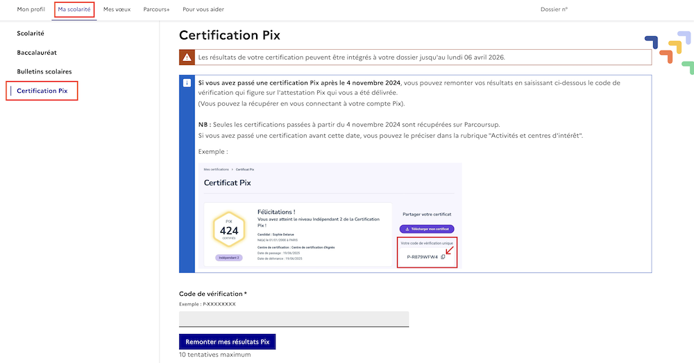 Si rien n’est indiqué, tu peux utiliser ton code de vérification, et faire remonter ton score Pix dans ton dossier.