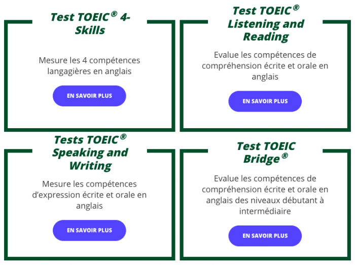 Plusieurs versions du test d’anglais existent, comme le TOEIC Listening and Reading, le TOEIC Speaking and Writing, le TOEIC 4-Skills ou encore le TOEIC Bridge.